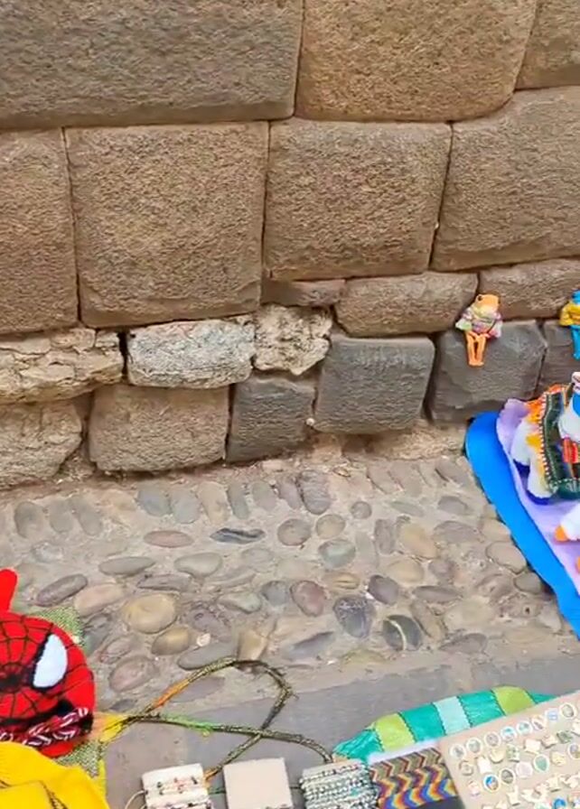 roadside market stand in front of an old stone wall with tightly-fitted stones of varying size