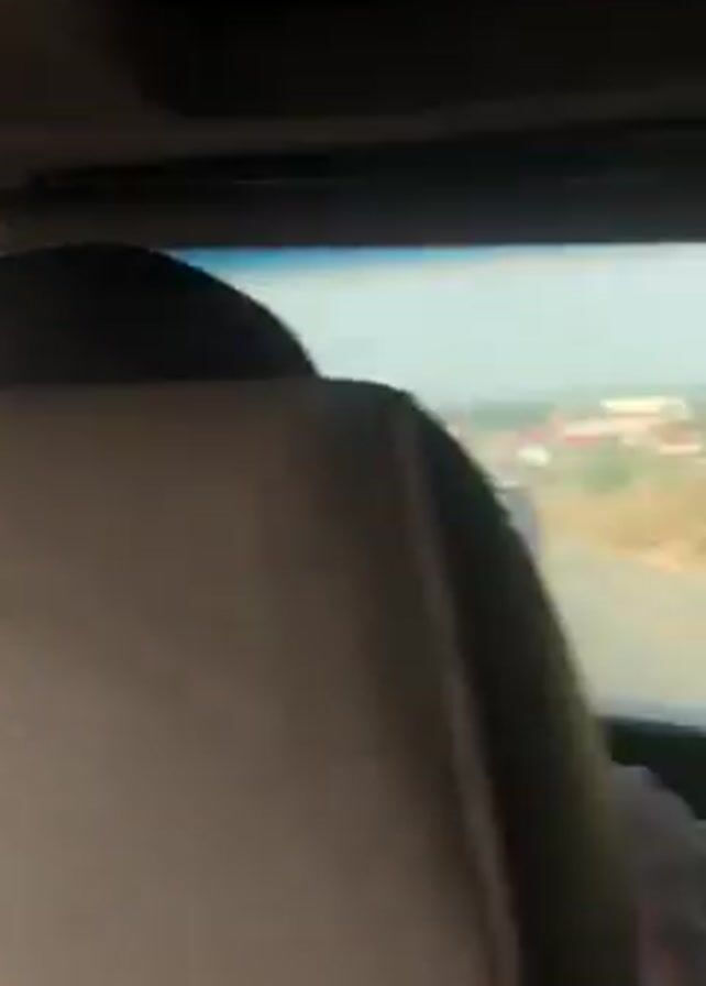From inside a car, a person with brown skin drives down a road. There are several other vehicles traveling in the same direction. The landscape on either side of the road is dry, grassy and there are some buildings in the distance. The driver's left hand is visible on the steering wheel. The car's dashboard is visible. The interior is generally clean and in good condition.