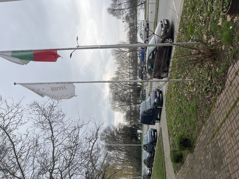 The scene depicts a street in the city of Varna, Bulgaria, under an overcast sky. In the immediate foreground, a red brick pavement transitions into a strip of patchy green grass with sparse dry leaves, featuring two dark green, circular shrubs. Two tall, white flagpoles rise from this grassy area. The left pole displays a white flag with the word "HOTEL" vertically oriented in gold lettering, topped by three gold stars. The right pole displays the national flag of Bulgaria, showing horizontal white, green, and red stripes. Beyond the grassy strip, an asphalt road runs parallel to the viewer. On the left lane, four vehicles are either parked or in slow transit: a partially visible silver sedan, a dark grey sedan, a teal Dacia Spring SUV with license plate "B 0713 XC", and a dark blue Opel Combo van with roof rails and license plate "B 288 HK". In the right lane, a brown Volkswagen Polo hatchback with license plate "B 1245 HM" appears to be in motion towards the viewer's right. Two double-headed streetlights are positioned between the road and the background. The background reveals a large body of water, likely Varna Lake or the Black Sea, bordered by a long line of bare deciduous trees indicating late autumn, winter, or early spring. A low white barrier or fence is visible between the road and the shore. Additional vehicles are parked along the water's edge on the far side of the road, including a light blue sedan. No individuals are visible in the scene.