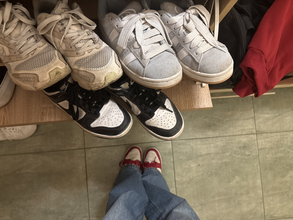 An overhead photograph captures an indoor scene, specified as being in Sofia, Bulgaria. The image foregrounds a section of a tiled floor and a multi-tiered wooden shoe storage unit. On the left, the lower legs of an individual are visible, dressed in blue denim jeans and red and white athletic shoes with white laces and soles. The floor beneath is composed of rectangular tiles in a light olive-green hue, exhibiting visible grout lines and minor surface marks. To the right, a light-colored wooden shoe rack or shelving unit is present. The uppermost visible tier holds two distinct pairs of footwear: one pair of worn black and white high-top sneakers, identifiable by a Nike swoosh on the lateral side, and one pair of white and light grey athletic trainers, both displaying significant wear and dirt. Directly below these, on a lower tier, a second pair of identical black and white high-top sneakers is positioned next to a pair of light grey suede Adidas Campus sneakers with white laces. A second, similar pair of light grey Adidas Campus sneakers is partially visible underneath the first. A white, low-profile shoe is partially obscured on the floor beneath the wooden structure. Below the shoe rack, a folded red textile garment, appearing to be a sweatshirt or hoodie, is present, partially overlapping a black fabric item, possibly a bag.
