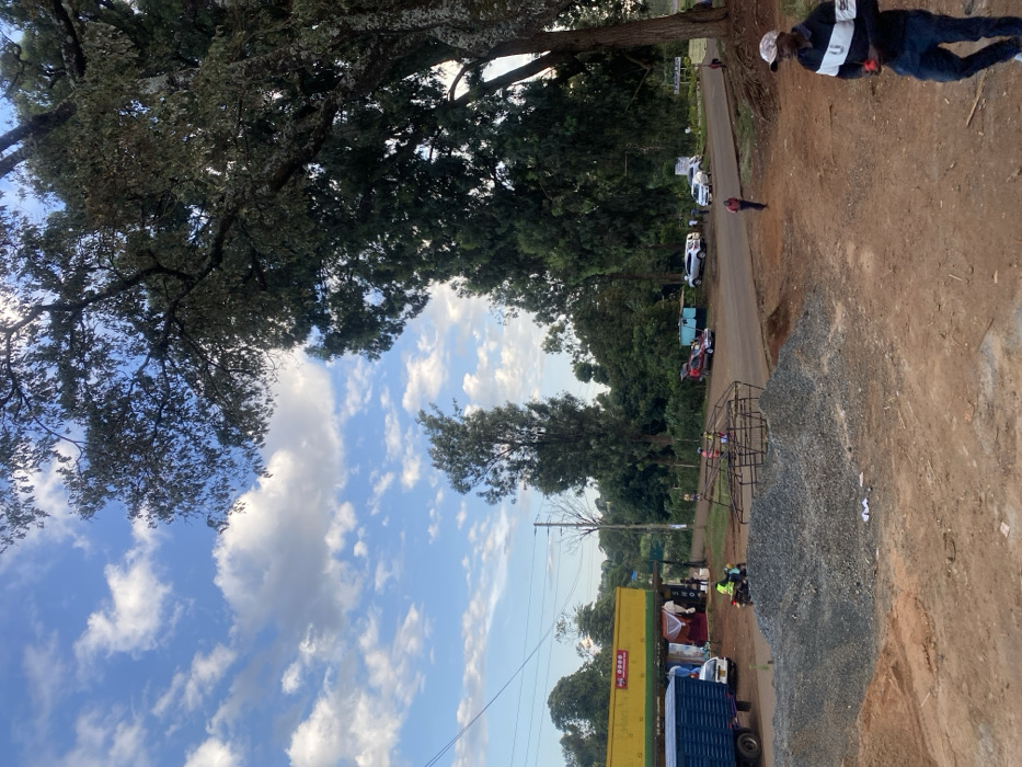 This image depicts a daytime street scene in Kianyaga, Kenya, characterized by a mix of commercial activity, construction, and natural vegetation under a sky with scattered cumulus clouds