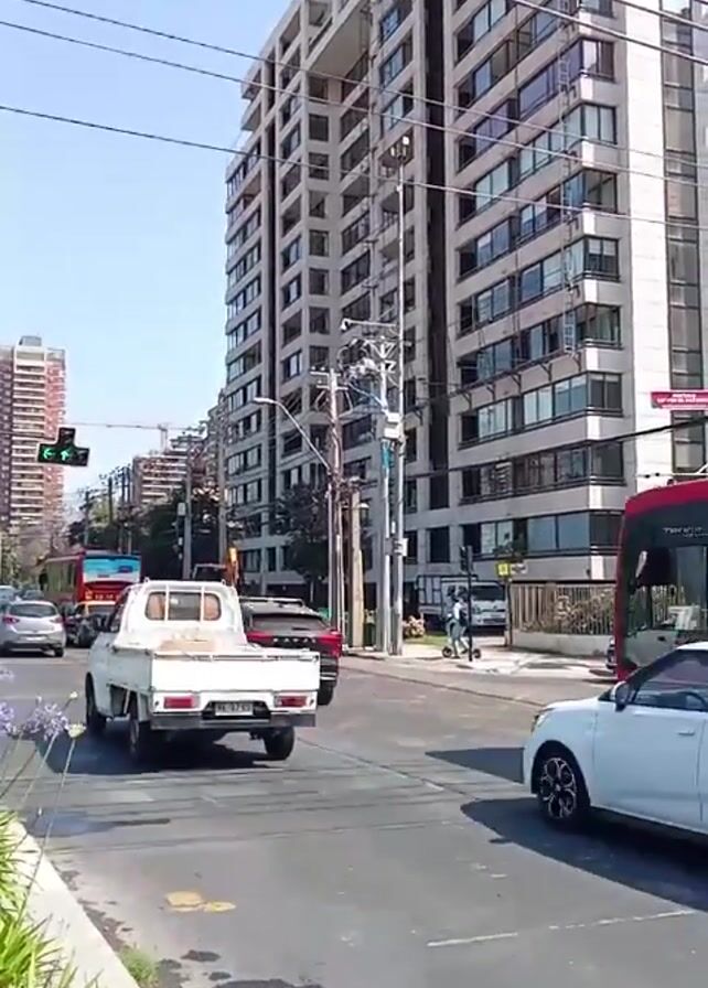 city street scene on a sunny day. Cars including a white pickup truck, a white Hyundai Tucson, and a white Peugeot are at a traffic light near a tall, modern apartment building. A red bus passes through the intersection. A cyclist wearing a yellow helmet and a delivery backpack rides by the intersection.