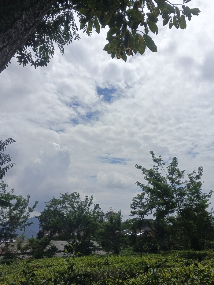 A lush green field of tea plants stretches towards a horizon punctuated by rooftops and trees. Above, a partly cloudy sky dominates, with patches of blue peeking through. The upper frame is bordered by tree branches and leaves, lending a sense of being framed by nature. The light is soft and diffused, creating a serene, natural scene. A small bird is flying in the middle of the frame.