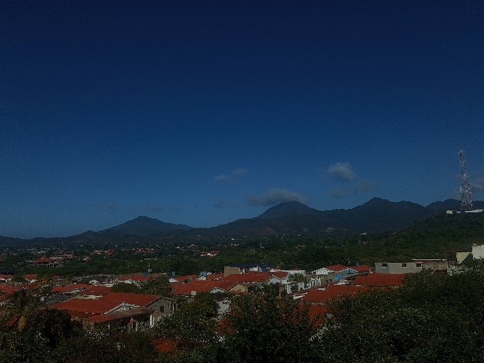 The scene shows a dense residential area with red-tiled roofs nestled amongst lush greenery. A series of verdant mountains form a backdrop against a clear, blue sky, punctuated by a few scattered clouds. A tall communications tower is visible on the right, adding a modern element to the otherwise natural landscape. The perspective suggests an elevated viewpoint, showcasing the sprawling settlement and the undulating mountain range.