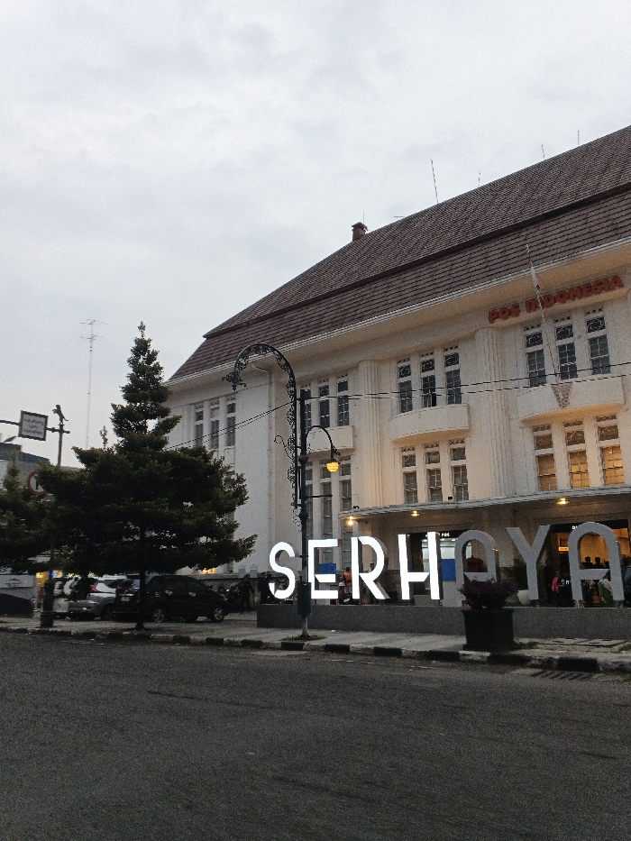 The image captures an exterior view of the Pos Indonesia building, identifiable by red lettering on its white facade, located in an urban area within an unknown city in Indonesia. The multi-story structure features a white facade with numerous rectangular windows, many illuminated, and a large brown tiled hip roof from which an Indonesian flag is flown. In front of the building, on a concrete sidewalk, large, illuminated white letters form the word "SERHOYA", with the letter 'O' partially obscured by an ornate black street lamp emitting a warm yellow light, and the letter 'Y' partially obscured by a dark planter box containing reddish-purple foliage. A tall, dark green coniferous tree stands on the left, behind a raised curb. Several parked vehicles, including a dark sedan, are visible further left. Indistinct human figures are discernible near the building's entrance, appearing as patrons or staff. The foreground consists of dark asphalt pavement, indicating a street. The sky overhead is overcast and light grey.