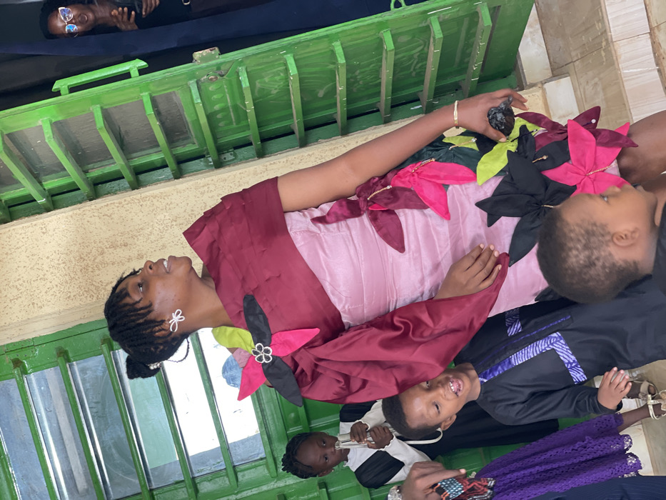 An indoor or sheltered outdoor scene in Kufena, Nigeria, features a central adult female and several children, with another adult partially visible. The primary subject is a woman with dark skin and dreadlocks, positioned center-right, looking towards the viewer's left with her mouth slightly open, suggesting speech or reaction. She wears a light pink fitted dress adorned with numerous maroon, pink, lime green, and black fabric floral embellishments, some with small beaded accents. A maroon/burgundy fabric piece is draped over her shoulders, one sleeve visible. Her left hand holds a small dark object and displays a thin gold-colored bracelet. To her left, partially obscured, a young girl in a black and white patterned top holds a silver-colored wind instrument to her mouth. Below the main woman's left arm, a young boy in a black top with purple patterned details looks towards the viewer's left with his mouth open. Further left, only a portion of a purple lace garment and a child's leg are visible. In the bottom right foreground, another young child's head is visible, also looking left. In the far right background, an adult female with dark hair and glasses (possibly blue-tinted) peers from behind an open green louvered door, looking towards the central woman, with her hand near her mouth. The immediate background consists of a textured light beige wall and green metal louvered windows or doors. The floor appears to be a light-colored, possibly tiled or concrete surface.