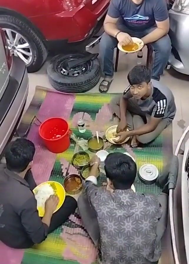 - "Four men are on a colorful mat on the floor eating from yellow plates" by FM-rkNqI2, licensed under CC BY 4.0