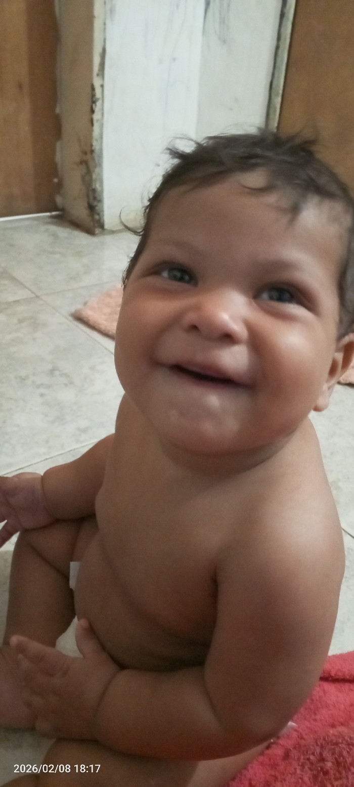 A close-up shows a smiling baby with dark hair and eyes, seated on a tiled floor. The baby, wearing a diaper, has chubby cheeks and a joyful expression. Behind the child is a wall with a wooden door or trim. The date "2026/02/08 18:17" is visible at the bottom of the image. A pink towel is also visible.
