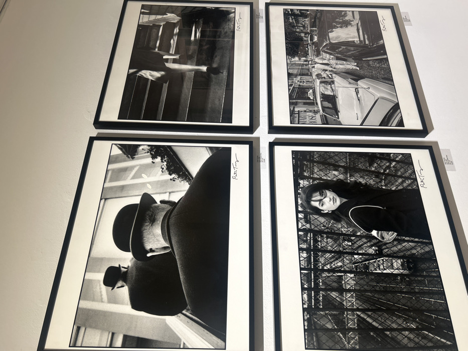 Four black and white framed photographs hang on a white wall. The top left photograph shows legs descending stairs. The top right photograph shows a street scene with cars and people. The bottom left photograph captures the back of a man in a suit and hat with a reflected image. The bottom right photograph features a woman posing in front of a lattice-like structure. All frames are black with a white border around the images. Each photograph bears a signature at the top right.