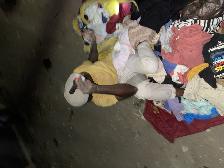 Overhead view reveals a person sprawled amidst a pile of colorful clothes on a concrete floor. Dressed in white pants and a yellow shirt, the individual wears a white cap and holds an object resembling a gun to their head. The clothing pile consists of various fabrics, patterns, and colors, including black, red, and striped garments. The surrounding concrete floor is dark and textured.