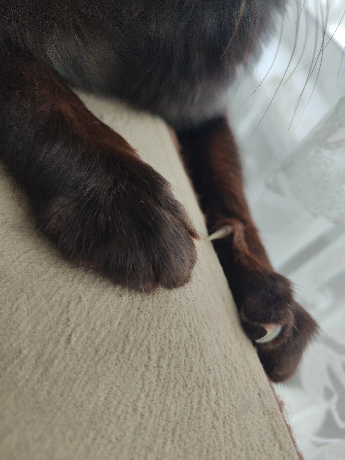 A brown cat's paws are resting on a tan textured surface. The cat's fur is dense and dark brown, almost black. Sharp, white claws are extended on one paw, showcasing their curved shape. The background is blurred, suggesting a window with sheer curtains. The focus is on the cat's paws and claws, creating a close-up and somewhat menacing view.