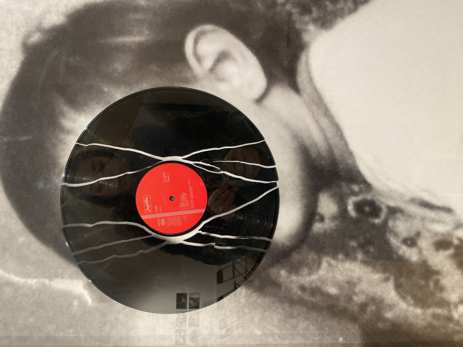 A black vinyl record with white, string-like lines across its surface rests atop a monochrome photograph. The record has a red center label with text and markings. The photograph appears to feature a person's face, with details like an ear visible. The scene is well-lit, highlighting the glossy surface of the record and the contrasting textures of the photograph. Reflections are visible on the record's surface.