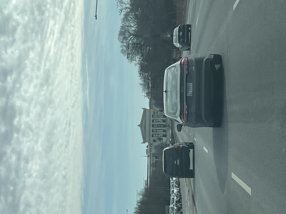 The image displays a daytime view of a multi-lane roadway in Chicago, Illinois, United States of America, looking south towards the Field Museum of Natural History. The sky is overcast with extensive cloud cover. In the immediate foreground, a dark gray Ford Fusion sedan occupies the center lane, viewed from the rear. Its Illinois license plate, "FJ 11175", is clearly visible. Ahead and to the left of the Fusion, a black SUV, possibly a Chevrolet Tahoe or Suburban, travels in the leftmost lane. Further ahead and to the right, another dark sedan is visible in the rightmost lane. To the left of the roadway, a long line of parked vehicles, primarily white, extends into the distance, flanked by bare deciduous trees. To the right of the roadway, a sparse line of bare trees and a street light pole are present. The prominent structure in the background is the Field Museum of Natural History, a large neoclassical building with a discernible colonnade and central pediment. Several large, multi-colored banners are draped vertically down the museum's facade, collectively spelling out "GRATITUDE". The surrounding trees are devoid of foliage, indicative of late autumn or winter. No pedestrians are visible.