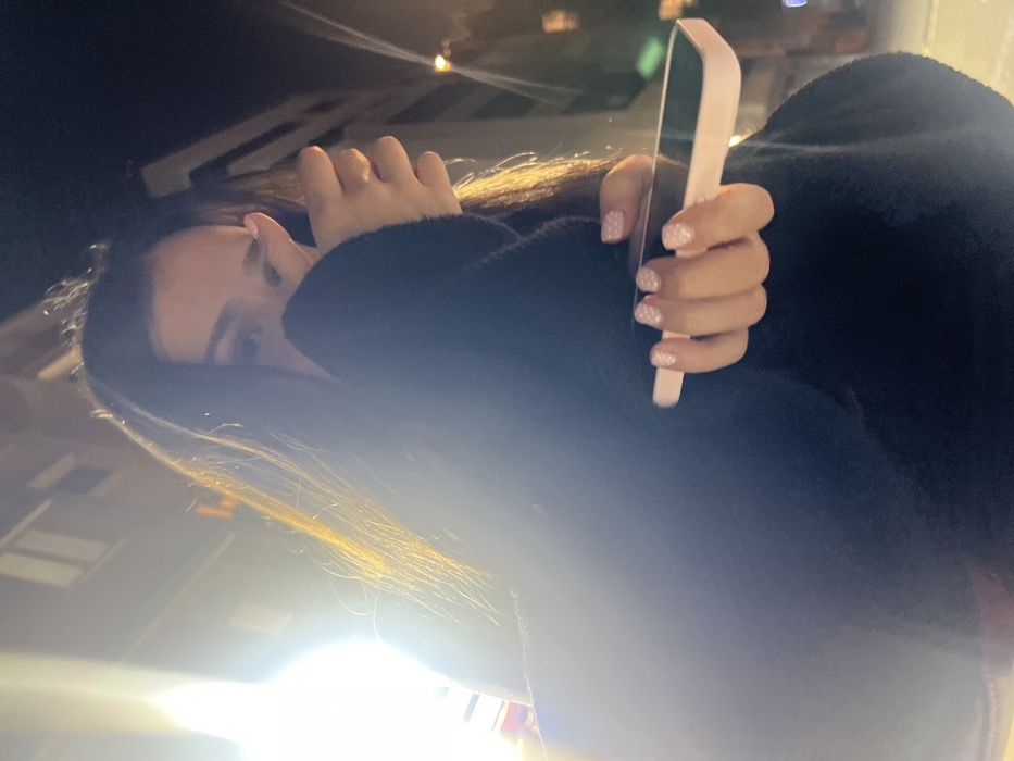 A young woman poses with one hand obscuring part of her face and the other holding a pink smartphone. She wears a dark jacket or coat, and her nails are painted with a decorative white pattern. Her hair is long and brown, with some strands appearing highlighted or reflecting light. The background suggests an urban or street setting, with blurry lights and buildings visible. A bright light source casts a glare upwards on the scene.