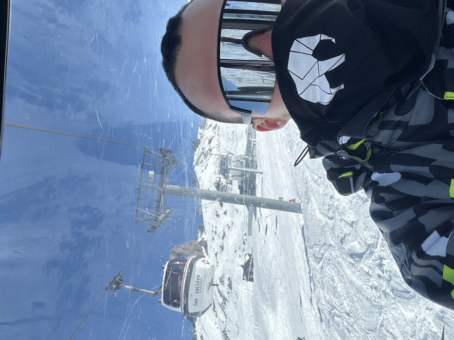 A selfie image captured from inside a gondola lift, depicting a person in ski attire overlooking a snow-covered mountain landscape in Les Allues, France