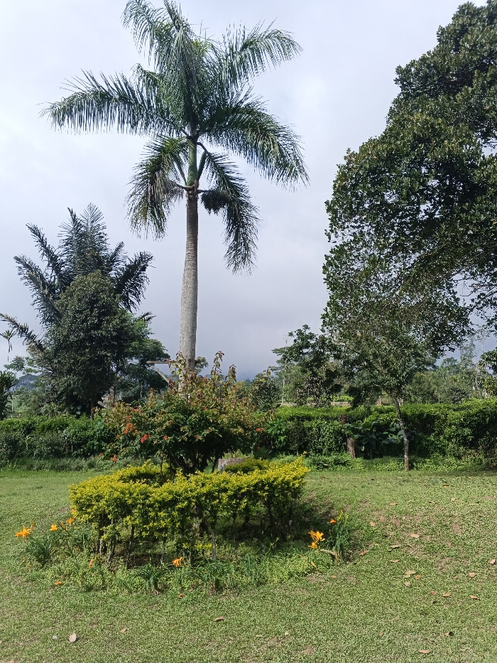 A lush green landscape under a cloudy sky features a tall palm tree with a slender trunk. Shorter trees and bushes form a dense backdrop. A bed of green shrubs with scattered orange lilies sits in the foreground, with fallen leaves scattered on the grassy lawn. The overall scene evokes a serene, natural setting.