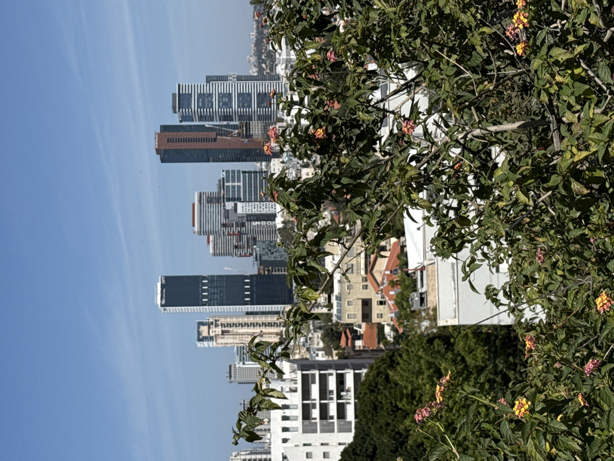 The image displays an urban panoramic view captured from an elevated position within Ramat Gan, Israel, looking generally southwest towards the Tel Aviv skyline. The foreground is dominated by dense green foliage, primarily a flowering shrub with clusters of small, multi-colored blossoms in shades of pink, orange, and yellow (likely Lantana camara). No individuals, actions, or interactions are visible in this section. The midground features a mix of architectural styles. To the left, a modern white residential building with multiple balconies and large windows is prominent. Below and to its right, older, smaller residential structures with light-colored facades and red-tiled roofs are interspersed with green trees. The background presents a dense, modern urban skyline under a clear blue sky with minimal cloud cover. Several prominent high-rise buildings and skyscrapers are visible: * The Leonardo City Tower (formerly Sheraton City Tower), a dark-clad skyscraper, stands to the left of the central cluster. * The Azrieli Sarona Tower, a tall, dark skyscraper with vertical lighting strips, is centrally located. * The B.S.R. Tower 4, a reddish-brown skyscraper with horizontal accents, is positioned to the right of the Azrieli Sarona Tower. * Further to the right, two white-and-glass Midtown Towers with horizontal banding are noticeable. * Additional high-rise buildings of varying designs and heights, along with construction cranes, contribute to the metropolitan vista. The scene is illuminated by direct sunlight, indicating daytime conditions. No specific individuals, actions, or interactions are discernable within the frame.