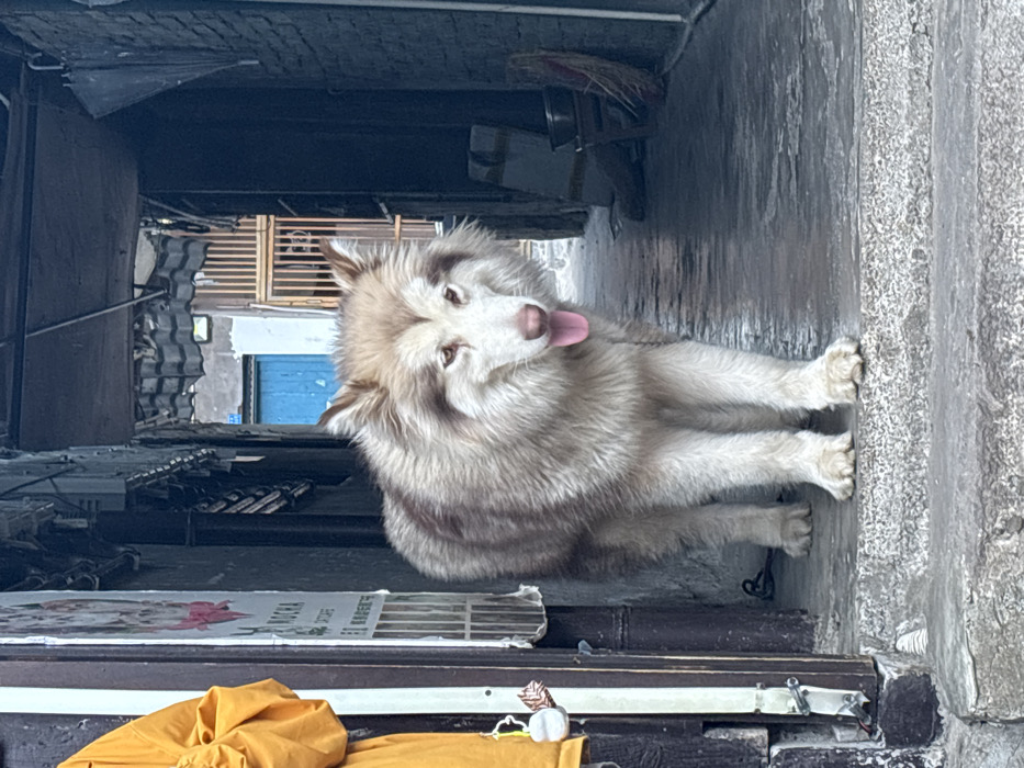 - "A large, fluffy dog, appearing to be an Alaskan Malamute with white and reddish-brown fur, stands centrally in a narrow, shadowed alleyway in Shapingba District, China" by FM-hd42B3, licensed under CC BY 4.0