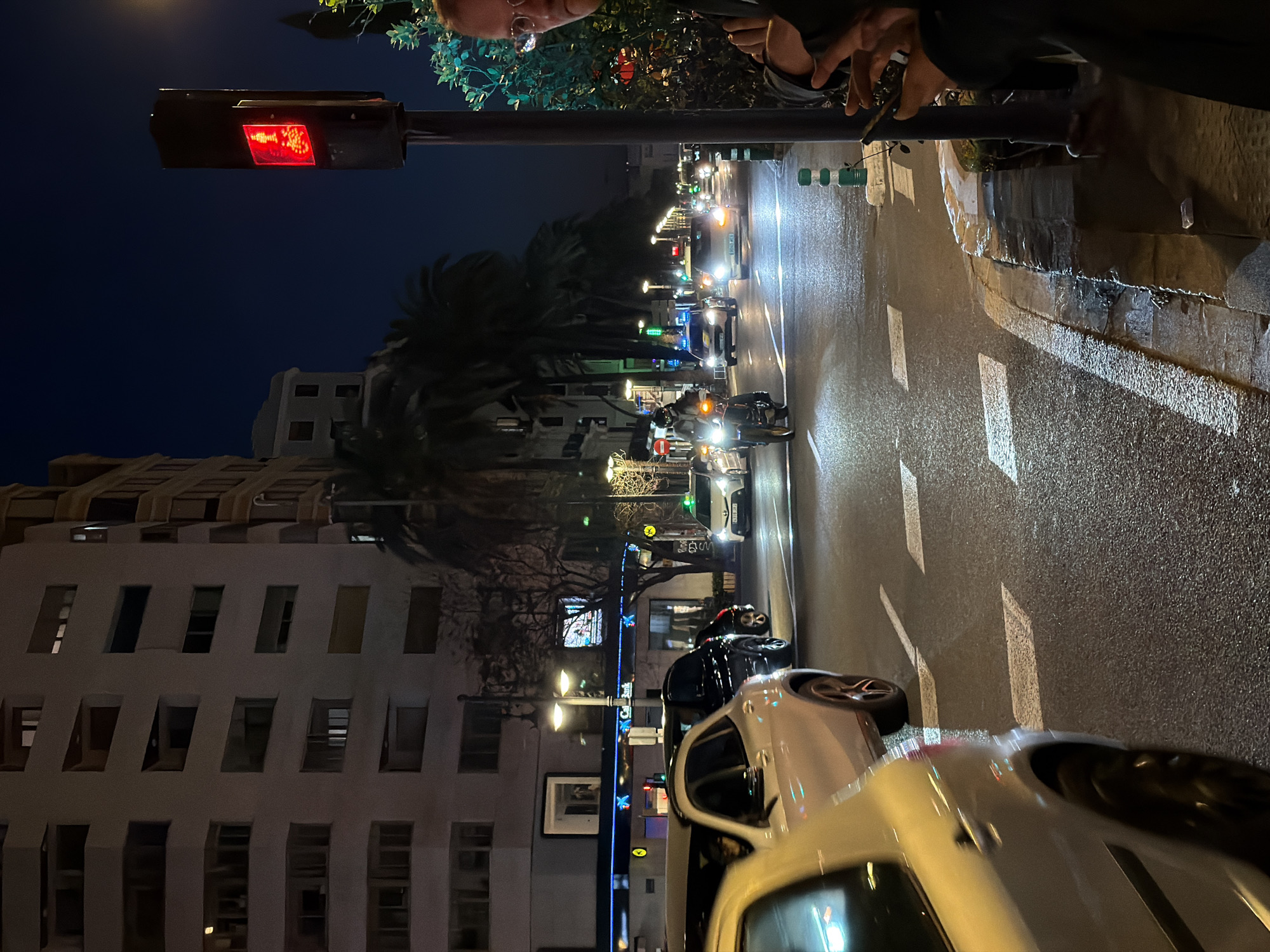 The image depicts a nighttime street scene in València, Spain, specifically along a wide boulevard, likely Gran Via Marqués del Túria, characterized by multi-story residential buildings and commercial establishments. In the foreground, on the right, the upper body of an individual wearing glasses is partially visible, holding and looking down at a smartphone with both hands. Immediately to their left stands a dark pole supporting a pedestrian and cyclist traffic signal, which displays a solid red standing figure and a red bicycle icon, indicating "Do Not Cross." The ground beneath the pole is a wet sidewalk, showing reflections from streetlights, with a curb bordering the road. Several green and white striped bollards are spaced along the curb. The midground features a multi-lane asphalt road with prominent white painted markings, including lane dividers and chevron-style arrows. Multiple vehicles are present, all with headlights illuminated. A light-colored SUV is partially visible on the far left, in motion. Directly behind it, a dark SUV is stopped. Centered in the middle lane, a motorcycle with a single rider wearing a helmet and a light jacket is proceeding, its bright headlights casting reflections on the wet road. Further down the street, a white taxi with a green roof light is visible on the right, identifiable by its Spanish license plate (e.g., "3350 JJI"). Other vehicles with active headlights are scattered further down the road, with what appears to be a police or emergency vehicle with blue flashing lights visible on the far left lane. The background reveals a row of multi-story buildings. On the immediate left, a large, white, modern residential or mixed-use building dominates, with numerous windows and balconies, some dimly illuminated. Further along the left side of the street, a prominent CaixaBank branch is visible, identified by its illuminated blue logo and lettering. The street is lined with numerous streetlights, tall palm trees, and other deciduous trees, their branches bare. The night sky above is a deep, dark blue.