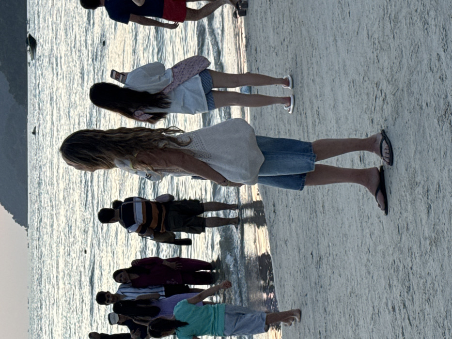 This image depicts a beach scene at Cenang Beach, Malaysia, at what appears to be dusk or early evening. The foreground is composed of light-colored sand, transitioning to shallow water in the midground, and open sea with a distant landmass in the background. In the immediate foreground, a Caucasian-presenting female with long, wavy light brown hair stands facing left, looking upwards. She wears a white top, blue denim shorts, and black flip-flops, carrying a large, light-colored woven shoulder bag on her left side. To her left, a young girl in a turquoise t-shirt and light blue shorts walks away from the camera towards the water, barefoot. To the right of the central female, another female, viewed from behind, wears a white long-sleeved top, blue and white striped shorts, and white flip-flops; she holds a smartphone in her right hand and carries a light pink crocheted shoulder bag. Further to the right, partially visible, a male figure in a blue t-shirt and red shorts walks towards the water, wearing dark flip-flops. In the midground, several individuals are wading in the shallow water. On the left, a group of approximately five people includes a male in a white shirt, a female in a purple garment, another female in a maroon outfit, and a male in a striped shirt and cargo shorts. Their lower legs are submerged. To their right, a male, viewed from behind, wears a horizontally striped orange and white shirt with dark cargo shorts and carries a small child on his back or shoulders; he also stands in the shallow water. The background features the calm sea with faint ripples and reflections on its surface. A small boat is visible in the water in the middle distance. A prominent, dark landmass, likely an island or peninsula, is silhouetted against the lighter sky on the horizon. The lighting suggests ambient light from the setting or rising sun, creating a soft, diffused illumination across the scene.