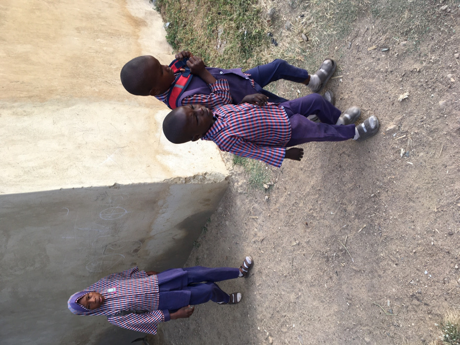 Three children are lying on the ground near a concrete structure and some greenery. Two boys, dressed in school uniforms with button-down shirts, navy pants, and sandals, are positioned on the ground. The third child, also in a similar uniform and a headscarf, is lying nearby. The ground appears to be a mix of dirt and gravel.