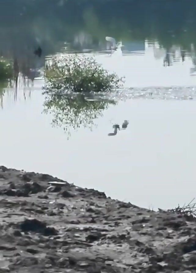 tranquil scene of a body of water reflecting trees on the opposite bank. In the center of the frame, a bird flies low over the water's surface, creating ripples. A utility pole's reflection is visible in the water. The foreground consists of a muddy, uneven shoreline. The overall lighting is soft and diffused.
