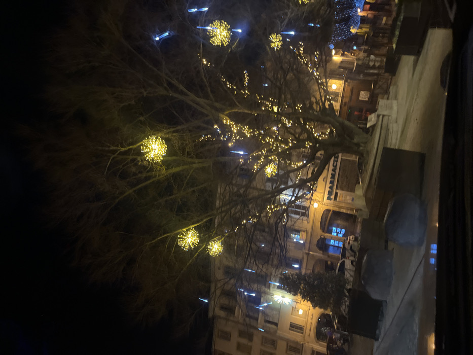 A nighttime urban scene reveals a tree decorated with spherical string lights. In the background, illuminated buildings with arched windows stand adjacent to a building with "PHARMACIE" visible on its facade. Planter boxes line the foreground, partially obscured by a reflective surface at the edge of the frame. The light contrasts with the dark sky and bare tree branches.