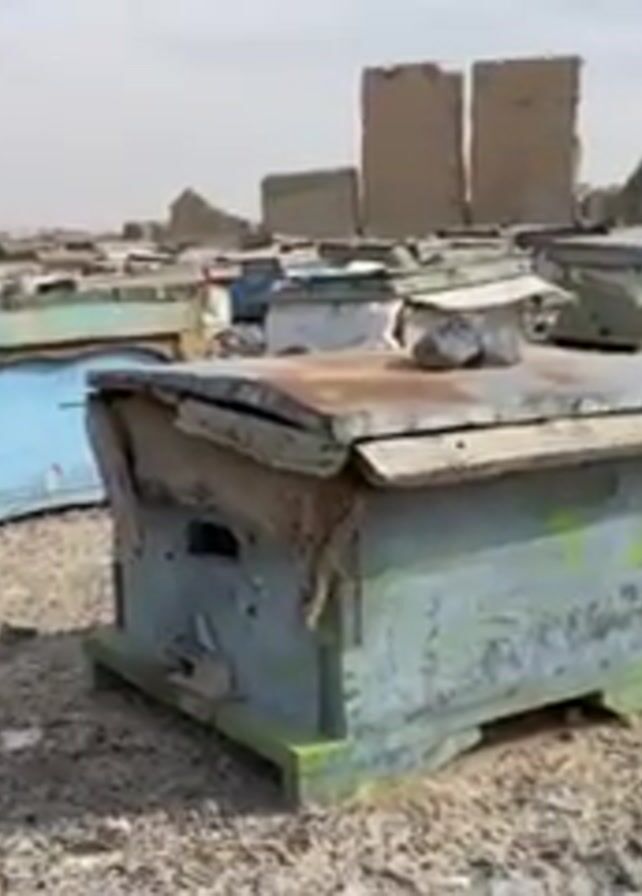 bee farm with a multitude of old, weathered beehives spread across a dry, barren landscape