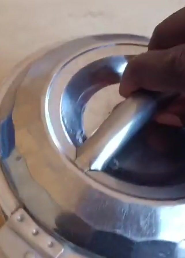 A person removes the lid of a stainless steel pot, revealing a small piece of dark brown, possibly burnt, food residue inside