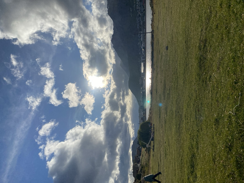 A bright sunny day with clouds scattered across the blue sky. A towering mountain rises beside a body of water reflecting the sunlight. A green grassy field slopes downwards, with some buildings visible near the mountain's base. A single person is seen lying on the grass in the lower portion of the frame. A blue lens flare adds an artistic touch.