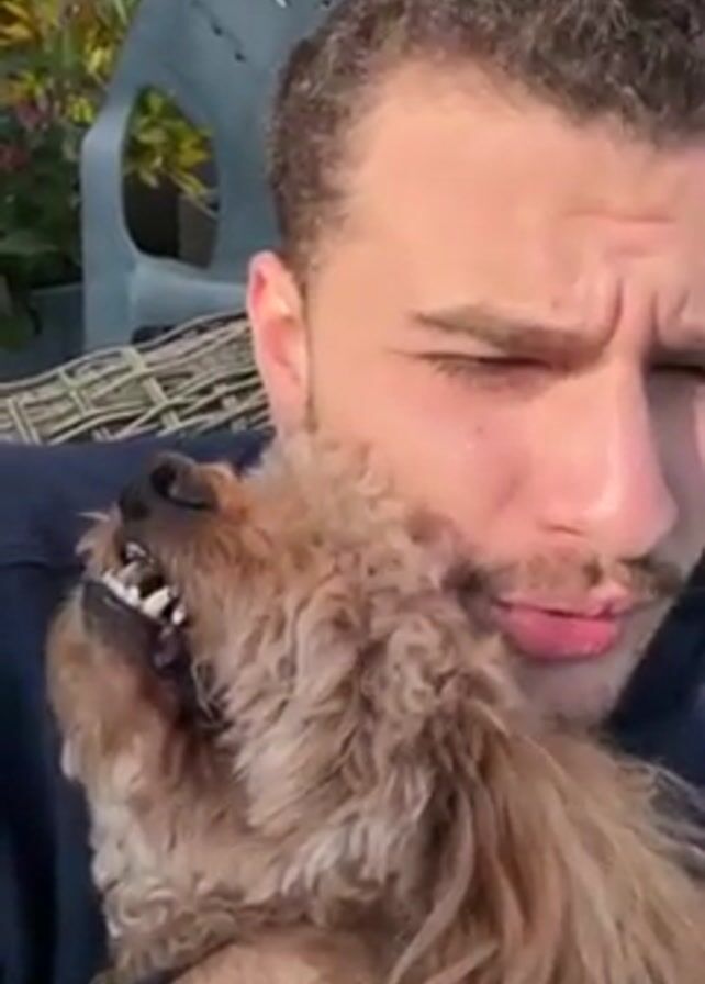 A person with light skin, dark brown hair and a short beard is holding a brown poodle up to their face. The poodle is baring its teeth. The person is breathing heavily and appears to be simulating the dog’s growl. They are outside in an area with plants, a gray plastic chair and some wooden trellis-like materials in the background.