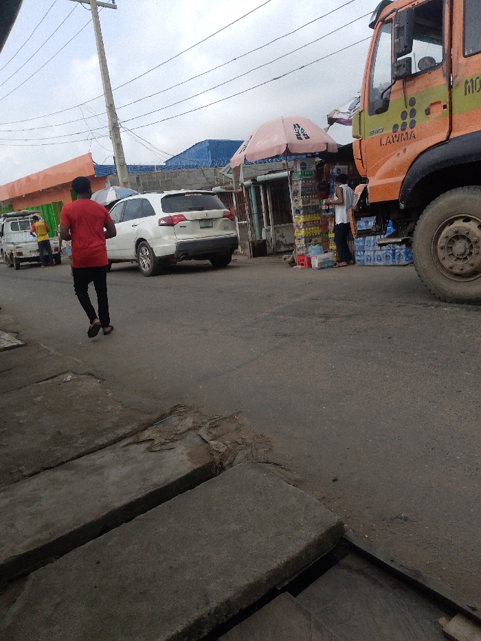The scene depicts a commercial street in Lagos, Nigeria, under an overcast sky. The foreground shows a grey asphalt road with damaged concrete drainage slabs on the left. A man in a red shirt and black trousers, wearing sandals, walks away from the camera on the asphalt, positioned left of center. To his right, a white Acura MDX SUV is parked facing away from the camera. Further right, an orange and green Lagos Waste Management Authority (LAWMA) truck is partially visible, occupying the right side of the frame, showing its front wheel and cab. Adjacent to the parked SUV and truck, a street stall operates under a pink Coca-Cola branded umbrella. This stall displays numerous bottled beverages, including water and soft drinks, stacked in crates and on shelves. A man in a white t-shirt and dark pants stands at this stall, facing its merchandise. In the background, behind the white SUV, a white utility pickup truck is parked. Two individuals, one partially obscured, wearing yellow shirts and dark trousers, are visible near this truck. Beyond the street stalls, structures with a blue corrugated roof and an orange awning are present, enclosed by a fence topped with barbed wire. A wooden utility pole with overhead power lines stands prominently on the left side of the road.