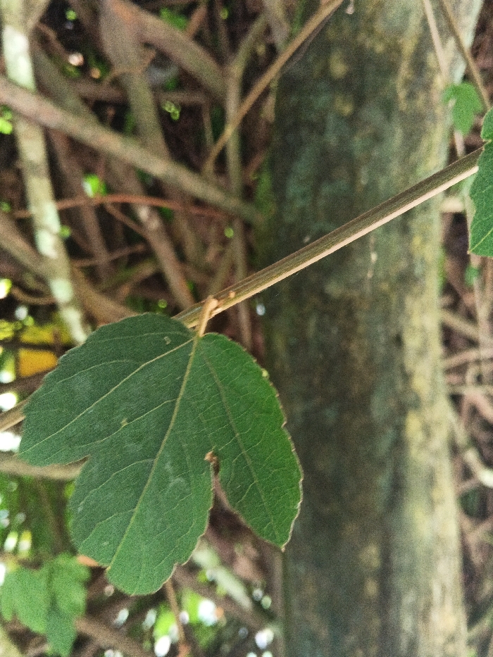 The image displays a close-up, static shot of a single, tripartite green leaf oriented with its lobes extending downwards and to the left. The leaf is attached to a thin, reddish-brown stem that extends diagonally upwards and to the right. Fine venation is visible on the leaf surface. The background is out of focus, revealing a dense arrangement of brown branches and a thicker tree trunk covered in greenish-grey lichen or moss on the right side. The environment is characterized by natural vegetation, indicative of a forested or heavily vegetated area within Masulog, Philippines. No human subjects, animals, or artificial objects are present.