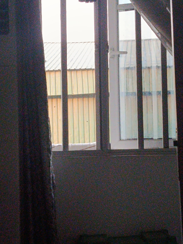 A dimly lit interior view features a barred window. The bars are dark, and the window frame is white. Outside, a corrugated metal roof of a building is visible. A curtain hangs to the left, obscuring part of the frame. The lower half of the frame is gray, and a hint of a green object is at the very bottom. The window offers a restricted view of the outside environment.
