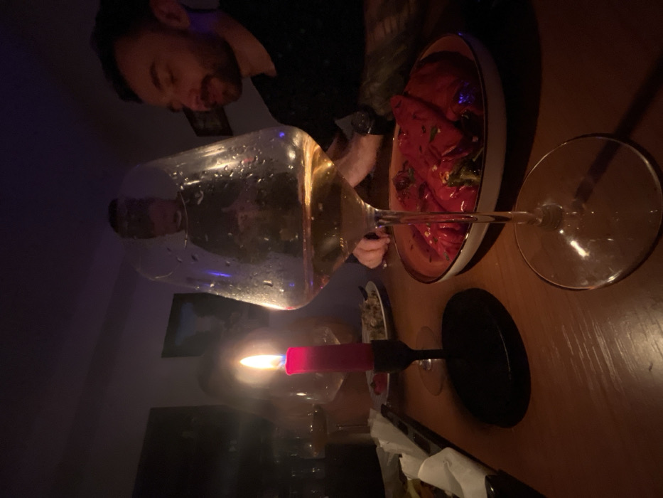 A table setting features a wine glass with condensation and golden liquid, a platter of vibrant red peppers, and a black candleholder with a lit red candle. A man is visible in the background, partially obscured and out of focus. The ambiance is dimly lit, casting shadows across the wooden table surface and creating a warm, inviting atmosphere. A menu and other dishes are visible.