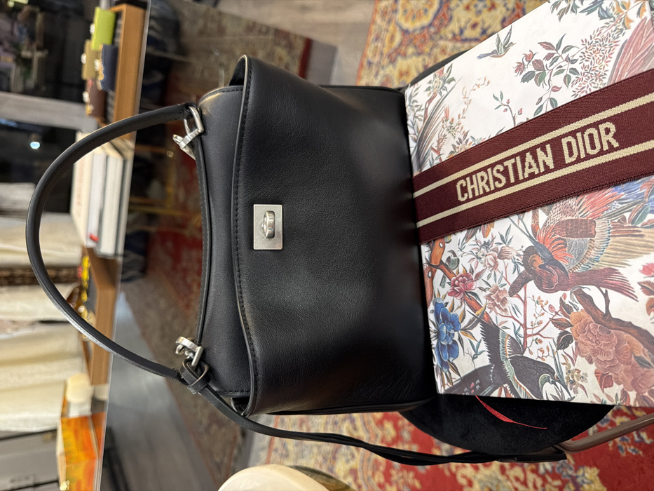 A black leather handbag, featuring a structured form, a single top handle, and a silver-toned metal clasp on its front flap, occupies the central foreground. A slender black leather shoulder strap is attached to the bag via silver-colored hardware. The handbag is positioned on a dark, possibly velvet-upholstered, surface, consistent with a stool or chair. Directly beneath the handbag, a rectangular object, identified as a decorative box or book, displays a vibrant, detailed pattern of birds and flowers. A burgundy woven strap with "CHRISTIAN DIOR" text in beige is draped across this patterned object. The immediate background reveals a dark, reflective surface, likely a glass table, upon which several items are arranged, including stacked books (one with a white cover, another with a red spine) and various small, colorful objects presented in wooden trays. The floor features a patterned rug in shades of red and gold. The scene depicts an interior commercial setting, such as a boutique or retail display, located in Yerevan, Armenia.