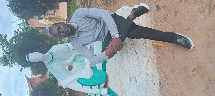 A man in a gray long-sleeved shirt and black pants leans against a seated statue. He wears a wristwatch and black shoes. The statue is painted white with turquoise accents. The background shows trees, a building with a red roof, and a dirt ground. The image is slightly rotated.