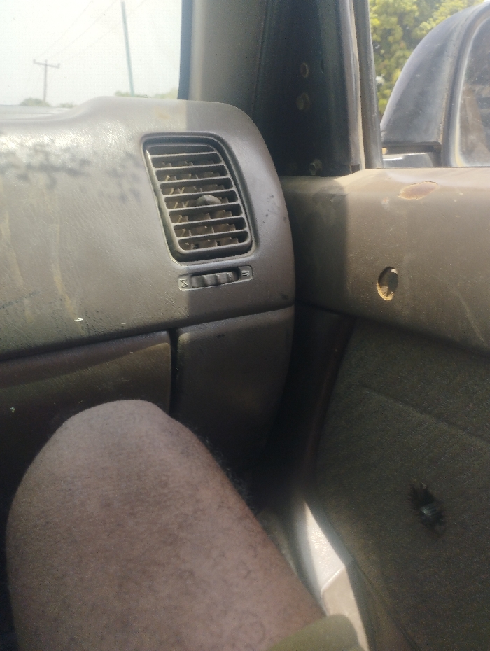 The image captures an interior view of a vehicle in Gudi, Nigeria, from a low perspective, likely from a seated passenger. The front dashboard, on the left, is dark grey, shows significant dust accumulation, and features a vertical air conditioning vent with a horizontal slider control. To the right, the vehicle's A-pillar or door frame is dark and secured with visible silver bolts. The upper section of the passenger door panel, also dark grey, exhibits rust spots and a circular indentation where a component is missing. The lower section of the door is covered in a faded, olive-green fabric with a dark, possibly torn, circular feature. In the lower left quadrant, a bare, hairy, light brown adult leg, likely a thigh and knee, is visible, with a strip of green fabric (possibly clothing) at its base. Through the windshield, a hazy sky and a utility pole are faintly visible in the distance. Green foliage is discernable through the passenger side window, indicating an outdoor, daytime environment.