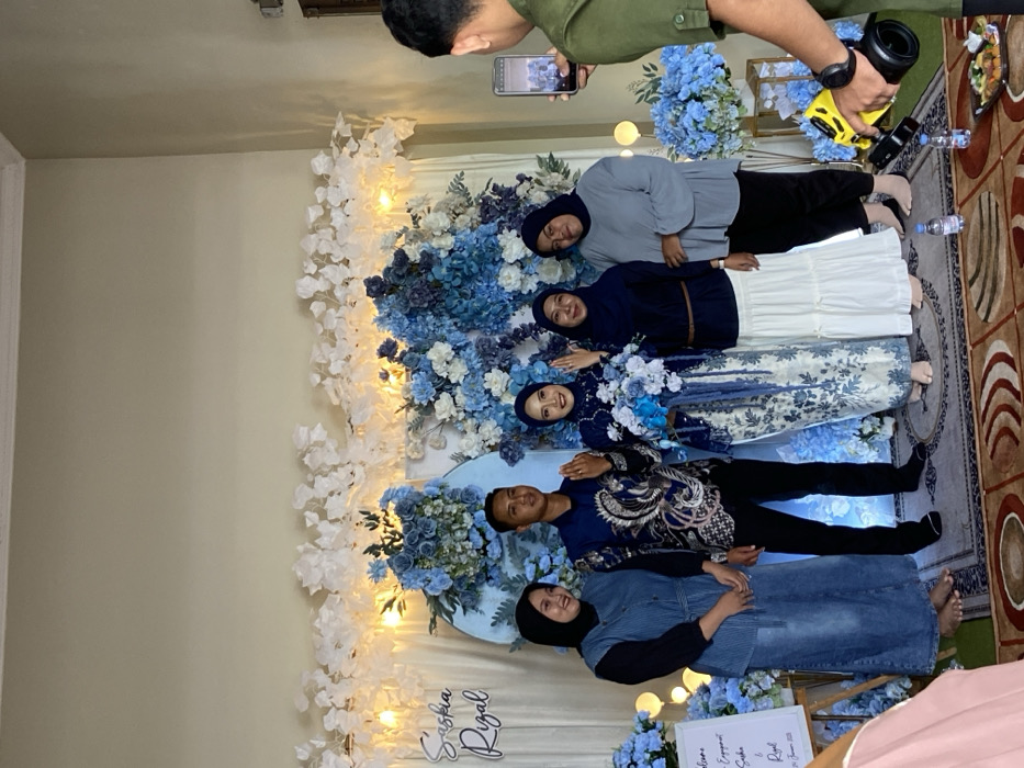 A group of six people poses in front of a floral backdrop for photos. A person in an olive green shirt and black watch takes a picture with a phone. Another person holds a camera, snapping photos. The backdrop is adorned with white and blue flowers. A sign with names, "Siskia & Rizal," is visible. The flooring is a patterned carpet.