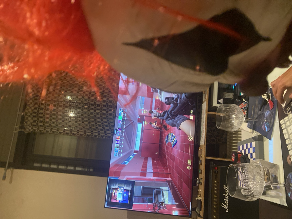 An indoor scene in Toulouse, France, depicts an individual engaged in playing a video game. The subject is partially visible from a rear-right perspective, wearing a bright red wig and a light-colored hooded garment. Their right hand operates a white computer mouse, with a segment of a white keyboard visible to the left. On a table in the mid-ground, two empty, patterned stemmed wine glasses are present. One glass rests on a blue and white checkered object, while the other is situated on a folded blue paper next to a red key and a silver key. Below this table, a "Marshall" branded audio amplifier is positioned. A large, flat-screen television dominates the center, displaying a first-person shooter video game. The game's environment features red and white tiled walls and floors, with a weapon held by gloved hands in the foreground. The user interface includes a mini-map in the top-left, health/ammo indicators in the bottom-left, and player status elements at the top center showing "0:02" and various icons. Text labels "LIBRARY" and "HOTEL" are visible within the game scene, where white in-game character avatars and a rainbow-striped object on the floor are also depicted. In the background, above the television, a window or glass door is covered by a dark, checkerboard-patterned curtain. The overall lighting of the room is dim.
