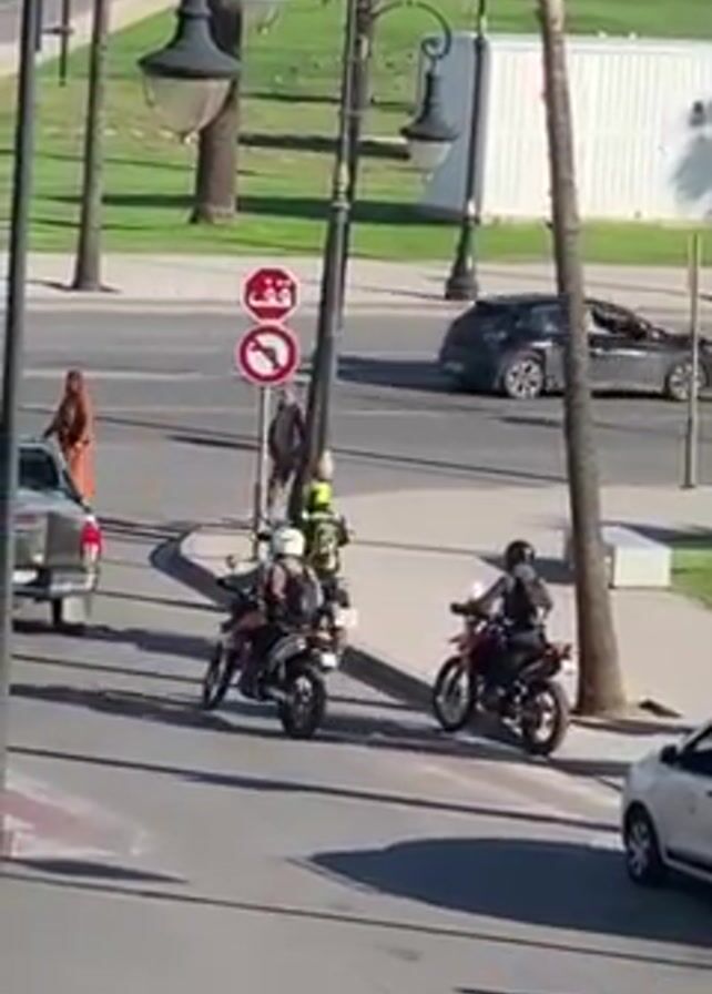 street scene with several vehicles and pedestrians. There are three motorcycles at an intersection, waiting to proceed. The first motorcycle is black with a white helmet on the rider, the second is green and black with a yellow and green helmet on the rider, and the third is a red color. Cars and a pickup truck drive past. A person dressed in brown walks on the sidewalk near the street. There are several palm trees lining the street, as well as a white building, lamp posts, and road signs.