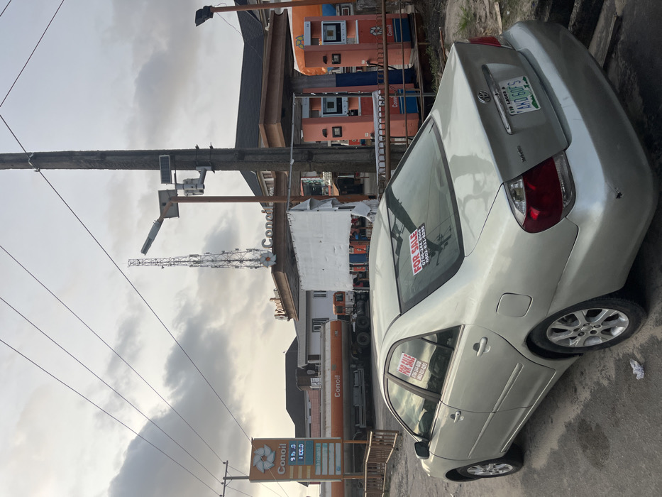 The image displays a street scene in Badore, Nigeria, primarily focused on a silver Toyota Camry sedan parked in the foreground, oriented with its rear towards the viewer