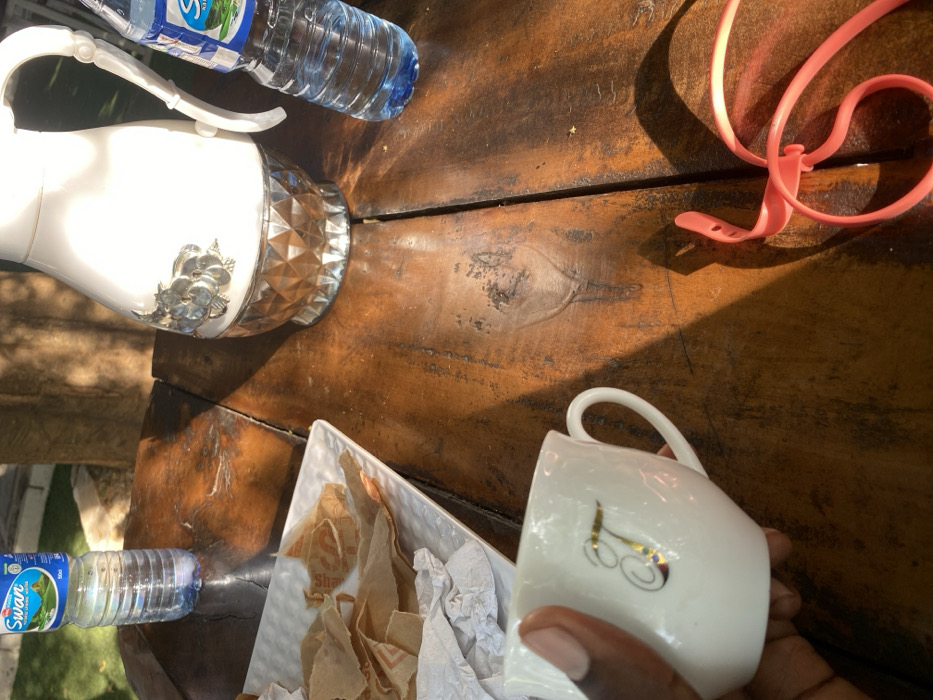 The image captures an outdoor scene at a wooden table in Jos, Nigeria, under direct sunlight. A dark-skinned hand holds a white ceramic teacup adorned with a golden initial "T" in the lower left quadrant. On a white rectangular plate to the left, crumpled light brown paper wrappers are visible, some bearing the letter "S" logo. Two partially filled plastic bottles of "Swan" brand bottled water are present; one is positioned on the upper left, and another on the upper right. A white and silver ornate thermal carafe, featuring a floral design and a textured base, occupies the central-right portion of the table. A coiled pink silicone strap lies on the lower right section of the table. The wooden surface exhibits grain and slight wear, with distinct shadows cast across it. Blurred greenery is visible in the background.