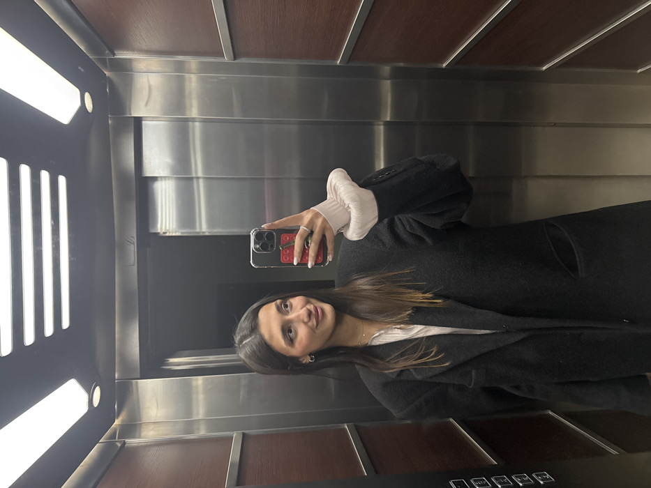 A woman in a black coat and light-colored ruffled sleeves is taking a selfie in an elevator. She is holding her phone with a clear case and red accents. The elevator has stainless steel walls and ceiling panels with dark wood accents at the top and bottom. Bright lights are visible on the left side of the elevator. The woman has dark hair, fair skin, and is smiling.