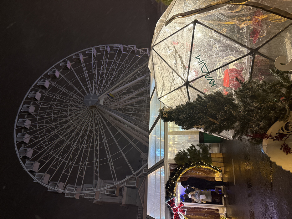 The image captures a nighttime scene at Kontraktova Square in the Podil district of Kyiv, Ukraine. A prominent white Ferris wheel, featuring numerous passenger cabins and a Ukrainian flag on its central hub, dominates the background against a dark sky. A multi-story classical building is partially visible behind the left portion of the Ferris wheel. In the mid-ground and foreground, a temporary outdoor event area is set up. To the left, several transparent or translucent marquee-style tents with visible internal lighting are present. An entrance to one of these tents is decorated with a large red bow and a circular archway illuminated with warm white lights. Two individuals are standing near this entrance; one person in a light-colored coat and white hat faces right, while another in a dark coat faces left. To the right, a transparent, geodesic dome structure is visible, internally lit, showcasing red seating elements inside. The Cyrillic text "КУЛАДІМ" (Kuladim) is displayed in green on the dome's exterior. Several small, artificial evergreen trees are strategically placed around the scene, some appearing lightly dusted with white material. One tree is topped with a pretzel-shaped ornament. White decorative elements resembling sleigh components are situated in the bottom right foreground. The ground throughout the lower portion of the image appears wet and reflective, suggesting recent precipitation or moisture.