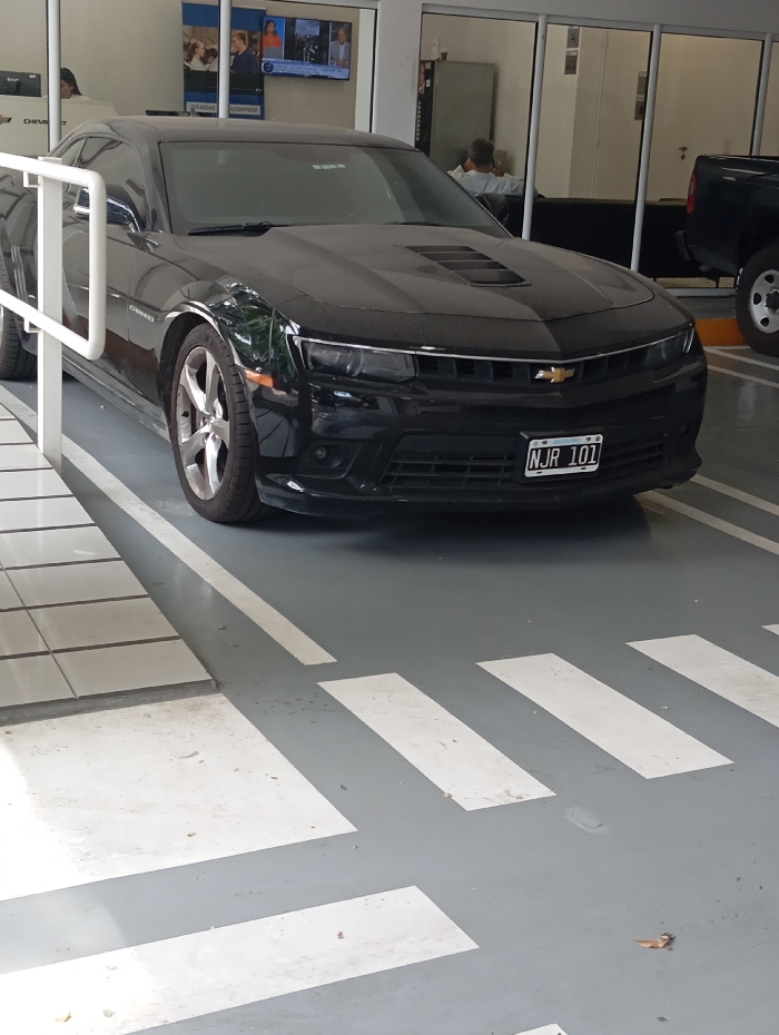 An interior view of an automotive commercial facility, likely a Chevrolet dealership or service center, is depicted. A black Chevrolet Camaro, appearing to be a 5th generation model, is prominently parked facing forward on a grey floor marked with white painted stripes resembling a pedestrian crosswalk. The Camaro's front license plate, "NJR 101," is visible, indicating an Argentinian registration. The vehicle exhibits a hood scoop and multi-spoke alloy wheels. To the left, a white metal barrier runs parallel to the car. In the background, large glass panels separate the area from an adjacent office or waiting room. Through these panels, several individuals and objects are discernible: On the far left, a person, possibly a female employee, is partially visible behind a counter bearing "CHEVROLET" branding. A television screen mounted on a back wall displays what appears to be a news or talk show program. Below the screen, another individual is seated at a desk. Further to the right, a person in a light-colored shirt is seated, facing away from the viewer, near what looks like a dark sofa. A silver filing cabinet or locker is also visible through the glass. A portion of a dark-colored pickup truck, possibly a Chevrolet S10 or Colorado, is visible behind the seated person. The environment is brightly lit, and the floor shows minor dust and a single fallen brown leaf near the center-right. While a precise street address is not discernible, the Argentinian license plate and the nature of the facility strongly suggest its location within a major urban area of Argentina, such as the city of Buenos Aires.