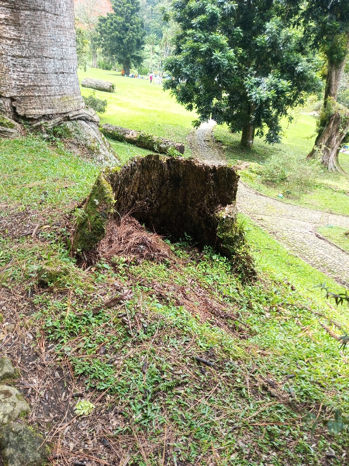 A tree stump, covered in moss and surrounded by fallen pine needles and various greenery, dominates the foreground. In the background, a grassy field with trees, logs, and a visible path are seen. Some people are picnicking in the distance. A large tree trunk stands to the left, and a paved pathway winds along the right side of the frame. The overall scene depicts a park setting on a slightly overcast day.
