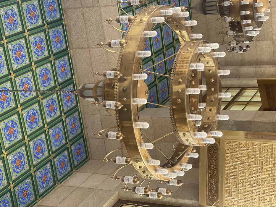 low-angle view of an ornate interior, likely a mosque or religious building. The ceiling is adorned with a pattern of green squares containing blue and red designs. Dominating the scene are large, golden, circular chandeliers with multiple cylindrical bulbs. Behind the chandeliers, there's a wall with intricate golden geometric patterns and a window. The lighting gives the space a warm, majestic ambiance.
