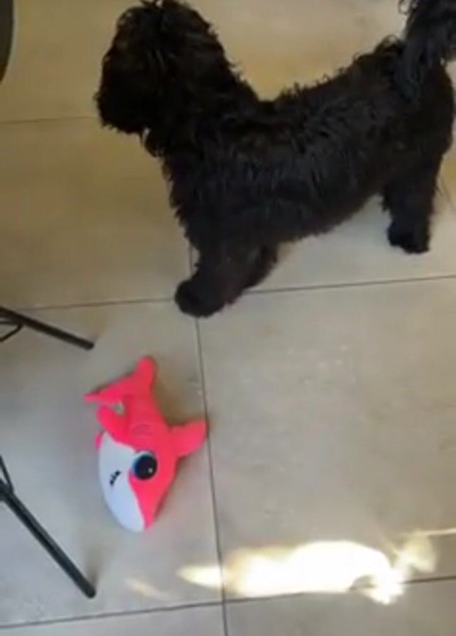 A black dog stands on a tiled floor, with a pink and white shark toy lying nearby