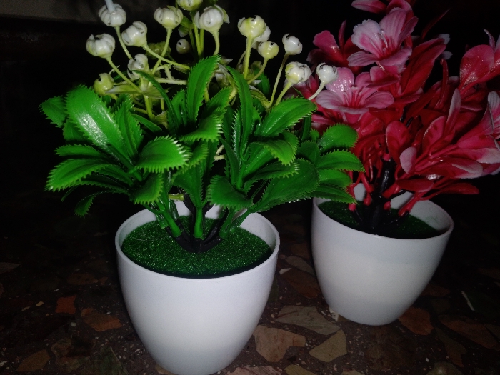 The scene is located in Barza Municipality, Syria. The image displays two artificial potted plants positioned on a tiled surface. The plant on the left consists of green plastic foliage with serrated edges and clusters of small, white, spherical flowers or buds, all contained within a white, ovoid ceramic pot. The base of the plant in the pot is covered with artificial green flocking resembling grass. The plant on the right features predominantly red and pink plastic flowers and leaves, also set in a matching white, ovoid ceramic pot with artificial green flocking at its base. Both pots are equidistant from the viewer and are arranged with the left plant slightly forward. The background is dark and indistinct. The tiled surface beneath the pots features irregular brown, beige, and reddish-brown patterns. Illumination is present but not overtly bright, suggesting an indoor or low-light setting. No individuals or active interactions are present.